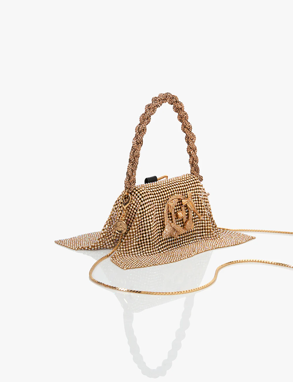 The world of the iconic Furbie continues to expand with the introduction of the Gold Rush Crystal Furbie . A jeweled guise for regal minaudieres, the Gold Rush Crystal Furbie is a euphoric creation reimagined by Outhouse Featuring a brilliant knotted top handle and metal loop, this statement creation is designed in PETA-approved vegan leather accentuating the OH V logo of the House on a rhinestone base. Its handcrafted nano bag with over 2000 champagne rhinestones that exude power and sophistication. This party essential can be gripped with its intertwined top handle, attached to a waist belt or can be carried crossbody with its complementing sling.