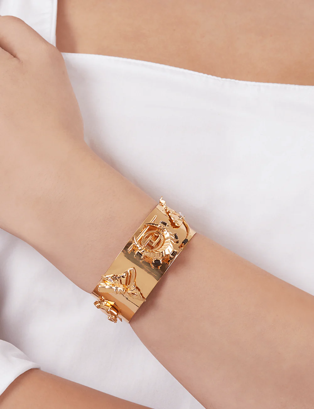 An irresistible jewel of desire, the O.H Crescent Half Wrist Cuff has been embellished with the finest onyx on 22K gold plating. The timeless icon has been adorned with 5 symbols specific to the house- the stallion head, the charcoal grey limited edition Kaputt crystal, the Imago butterflies, the majestic flutter wing and the onyx dragonfly, handcrafted for the empowered personality of the Outhouse woman.