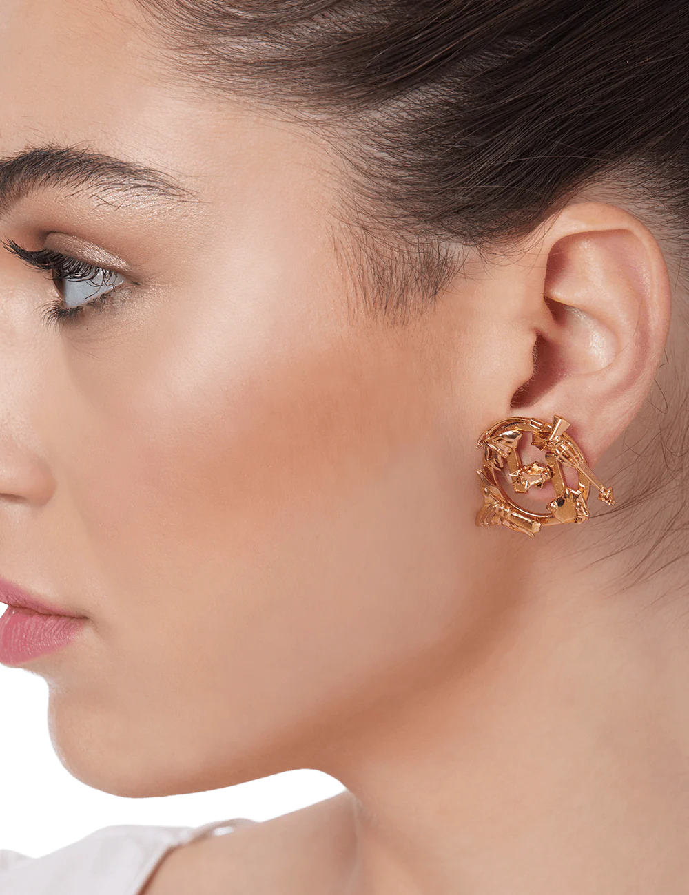 Staying true of the characteristic of the house, the OH V Mini Studs have been crafted with a radiant gold finish. Designed and developed at the atelier the 22K gold plated ear adornments have been finished with engravings of the five symbolic emblems of the house - the stallion head, the charcoal grey limited edition Kaputt crystal, the Imago butterflies, the majestic flutter wing and the onyx dragonfly.