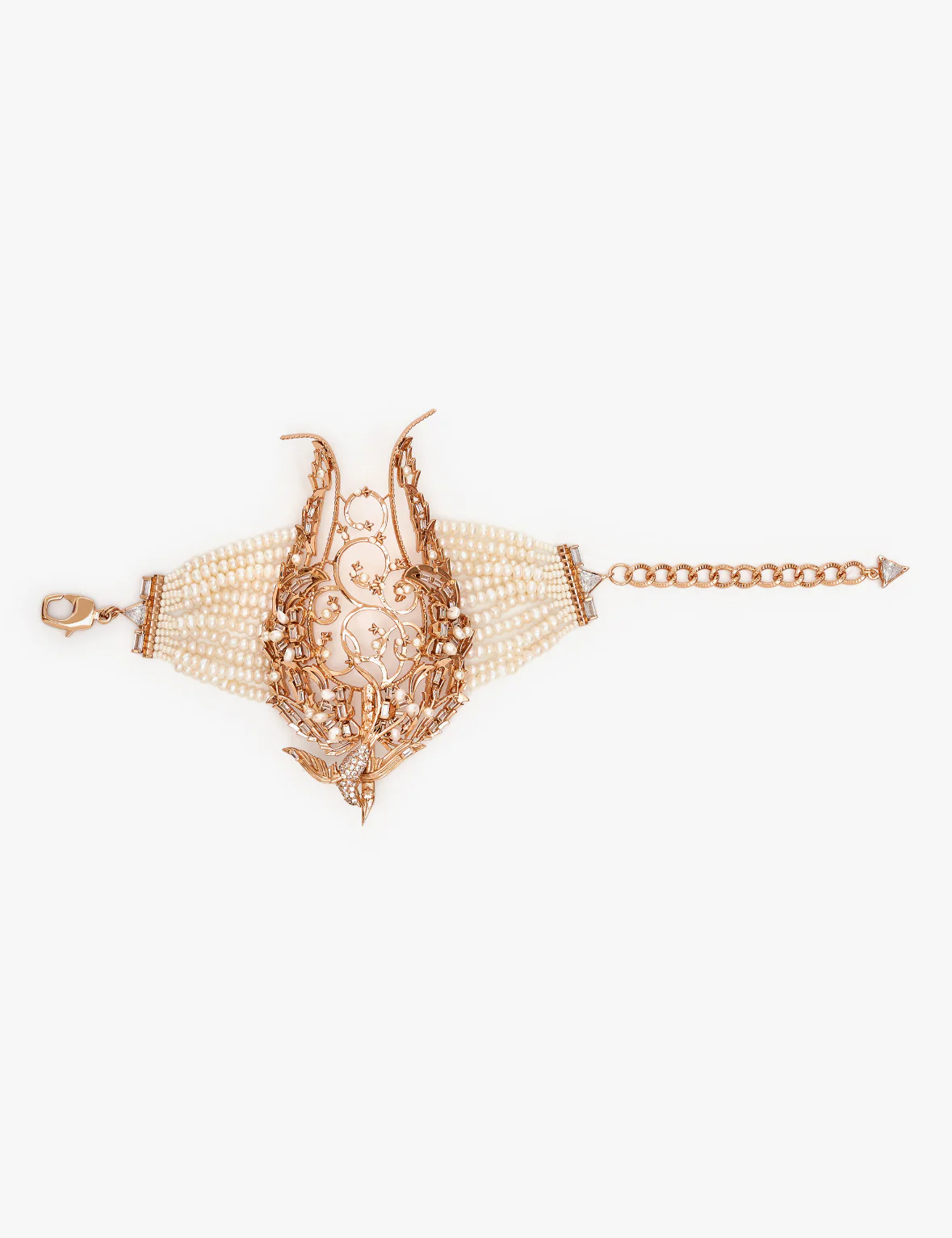 Declare the permanence of your love with Outhouse Bridal Jewellery. Take a wander in a pearl wonderland with the Pirouette Pearl Handwrap. The magnificent work of this sumptuous adornment is set in 22-carat rose gold plating, handcrafted at our atelier. A keen sense of technique and detail is reflected in entwined tentacles. A fine example of distinctive design aesthetic.