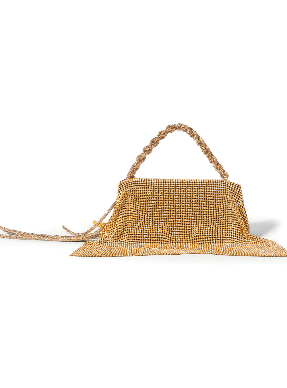 The Gold Rush Furbie Goes in an all new MIDI size . Remodeled with iconic flair, the Midi Gold Rush Furbie embodies Outhouse vision of radiance and timelessness in new proportions. Exquisitely elongated to portray the signature crystal camaraderie of the House, the bag is created in the perfect size to accommodate your phone, along with all your essentials. Brilliantly intertwined with a top handle and a central metallic OH V Monogram, the Midi Gold Rush Furbie emphasizes on its euphoric essence through the skillfully patterned four thousand champagne crystals that envelope the PETA-approved vegan leather base. Making it the ideal companion for the day, the bag versatility enables it to be styled as a crossbody bag, waist bag, or a scintillating handheld- to embellish an extravagant party outfit or a casual off-duty look.